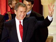![]() President-elect George W. Bush flashes a "W" sign after addressing the nation from the Texas House of Representatives on Wednesday, Dec. 13, 2000. (Source:AP) |